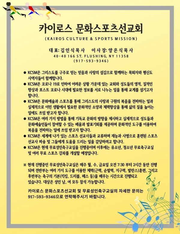 문화예술과 스포츠를 통하여 전도와 선교에 쓰임 받기위해 '카이로스 문화스포츠선교회'를 창립합니다. 목회자들과 성도들을 모시고 창립예배를 드림으로 선교회 창립을 알려드려야 하지만 코로나19로 대면모임이 어려운 관계로 비대면의 방법을 통해 선교회 창립과 사역이 시작됨을 알려드림을 이해해주시기 바랍니다.