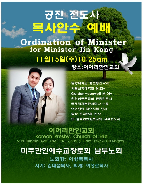 공진 전도사가 남부노회주최(노회장: 이상목 목사) 로 목사안수를 받는다. 장소는 이어리한인교회에서 2020년 11월15일