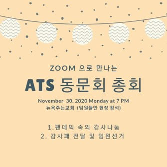 ATS 한인 동문회 정기 총회를 코로나 19 상황으로 인하여 아래와 같이 ZOOM으로 모이게 되었습니다.