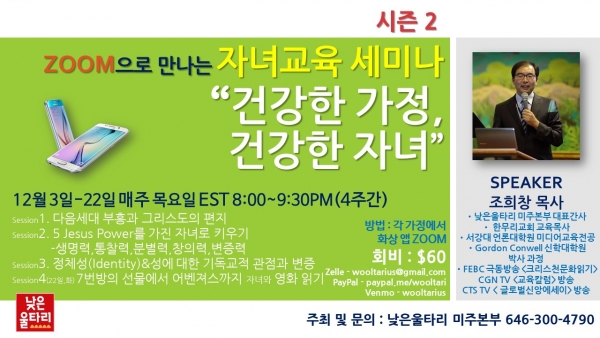 낮은울타리 미주본부(대표간사 : 조희창 목사)에서 "건강한 가정, 건강한 자녀"를 세워가기 원하는 부모님, 사역자님들을 위한 <Zoom으로 만나는 자녀교육세미나-시즌2>를 엽니다.