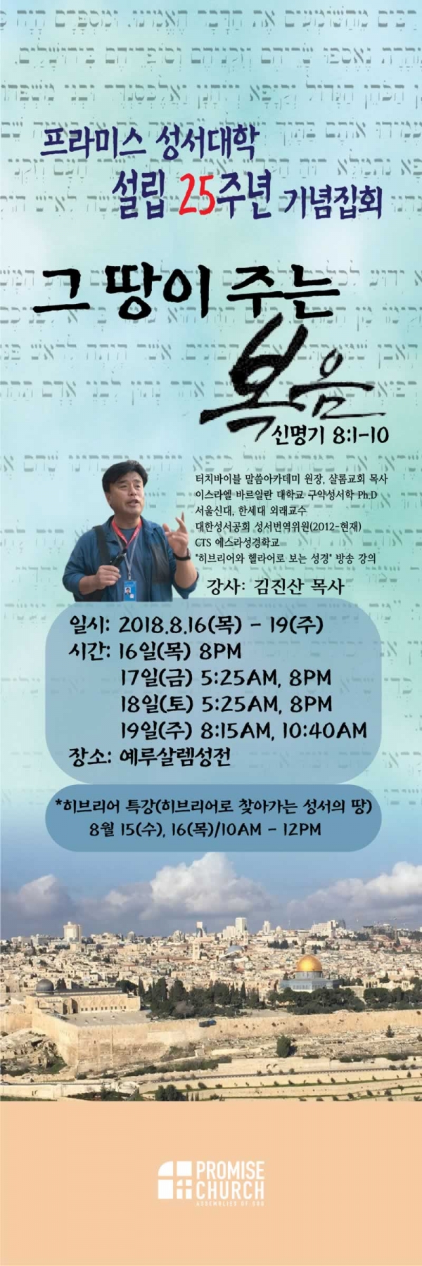 프라미스교회(허연행 목사)는 교회 부설 평신도성서대학 설립 25주년을 맞이하여 기념집회를 개최한다. 이번 집회는 이스라엘 바르일란 대학교에서 박사 학위를 받고 이스라엘에서 20년을 역사, 언어, 지리, 문화 연구 활동에 매진하여 현재 최고의 이스라엘 전문가로 평가받는 김진산 목사를 강사로 초청했다.