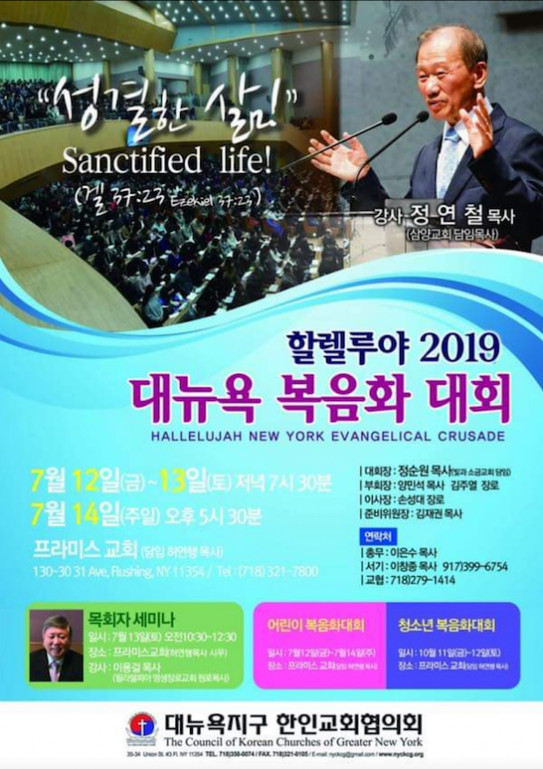 대뉴욕지구한인교회협의회(회장 정순원목사) 주최 2019년 할렐루야복음화대성회가 오는 7월 12일 부터 14일까지 프라미스교회(담임 허연행 목사)에서 ‘성결한 삶’(Sanctified Life)의 주제로 개최된다.