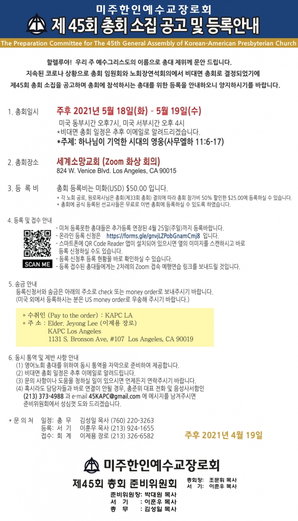 미주한인예수교장로회 제45회 총회 소집공고 및 등록 안내