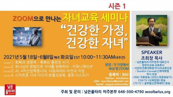 낮은울타리 미주본부(대표간사 : 조희창 목사)에서 "건강한 가정, 건강한 자녀"를 세워가는 <Zoom으로 만나는 자녀교육세미나>(시즌1 5기)를 엽니다.