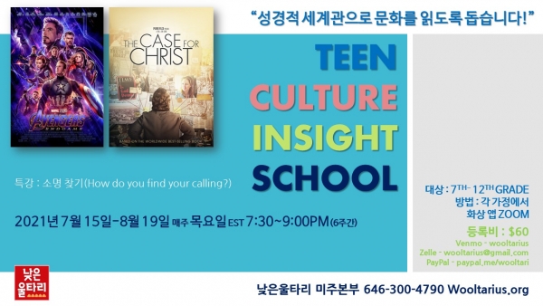 Teen Culture Insight School은 2021년 7월 15일부터 8월 19일까지 매주 목요일 오후 7시30분부터 9시까지(미주동부시간) 6주간 진행됩니다..[미 서부 시간 4:30~6:00 PM]