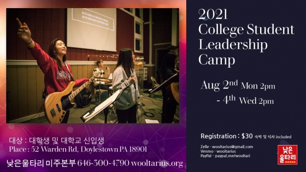 낮은울타리 미주본부(대표간사 : 조희창 목사)에서 대학생 및 대학교 신입생을 대상으로 2021 College Student Leadership Camp를 엽니다.