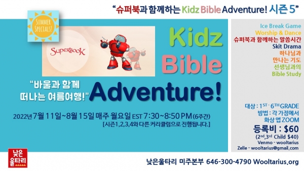 키즈 바이블 어드벤쳐 시즌5(시즌1,2,3,4와 다른 6개의 커리큘럼으로 진행됩니다)는 2022년 7월 11일 부터 8월 15일까지 매주 월요일 미주동부시간 7:30~8:50 PM 6주간 진행됩니다.