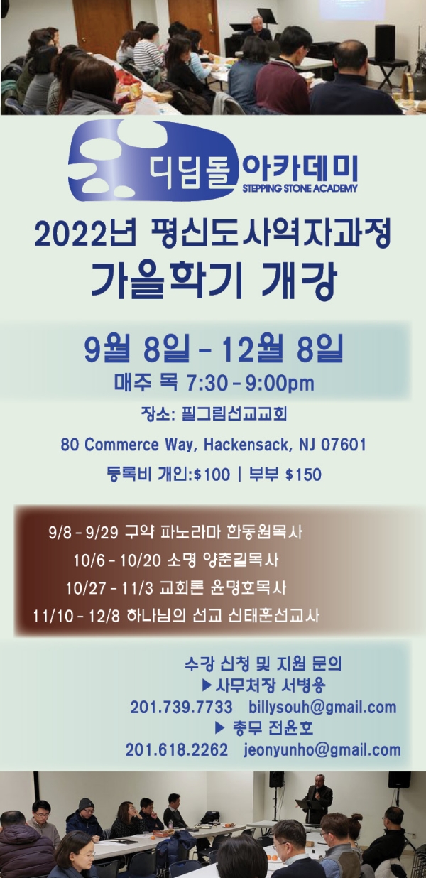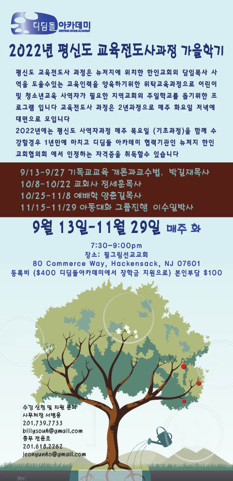 교육전도사 과정은 2년 과정이지만, 올해에는 평신도 사역자 과정을 함께 수강할 경우, 1년만에 마치고 디딤돌아카데미의 협력 기관인 ‘뉴저지한인교회협의회’에서 인정하는 교육전도사 자격증을 취득할 수 있습니다.