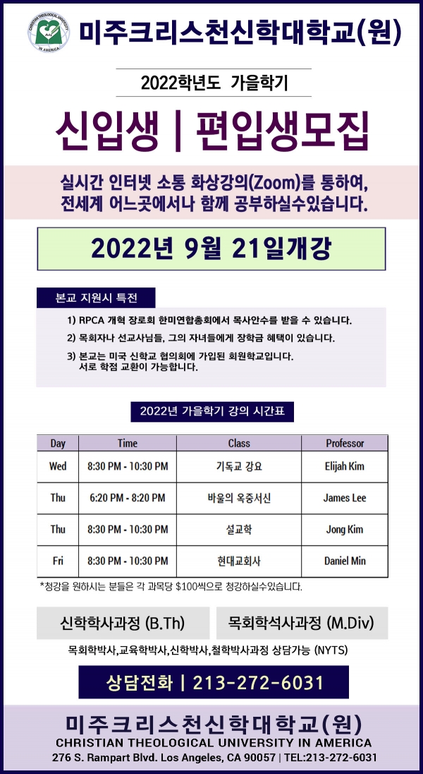 미주크리스천신학대학교 2022학년도 가을학기 학생모집