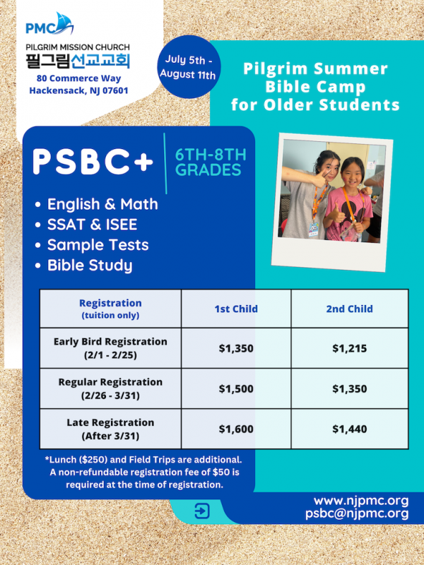 자세한 사항은 필그림 선교교회 홈페이지 (http://www.njpmc.org/main/sub.html?Mode=view&boardID=www28&num=10020&page=&keyfield=&key=&bCate=) 에 있는 교회학교 게시판을 확인해 주십시요.