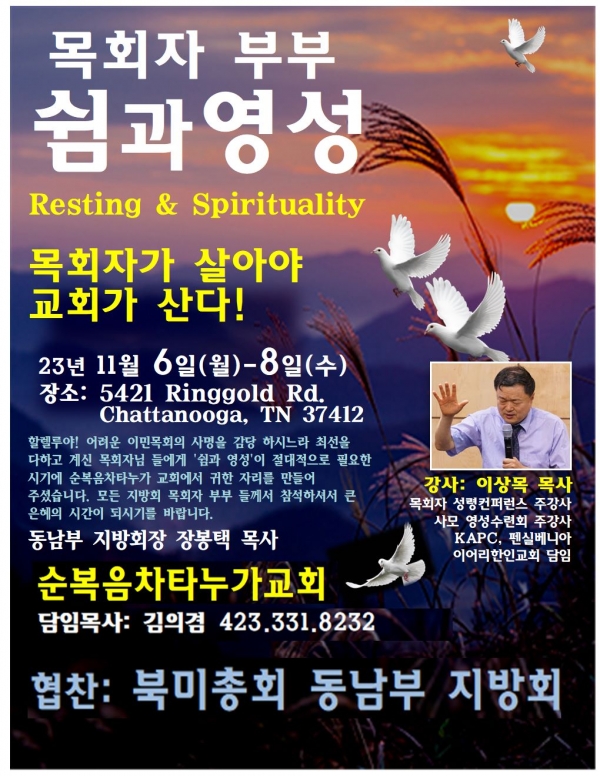 할렐루야! 어려운 이민목회의 사명을 감당 하시느라 최선을 다하고 계신 목회자님 들에게 '쉼과 영성'이 절대적으로 필요한 시기에 순복음차타누가 교회에서 귀한 자리를 만들어
