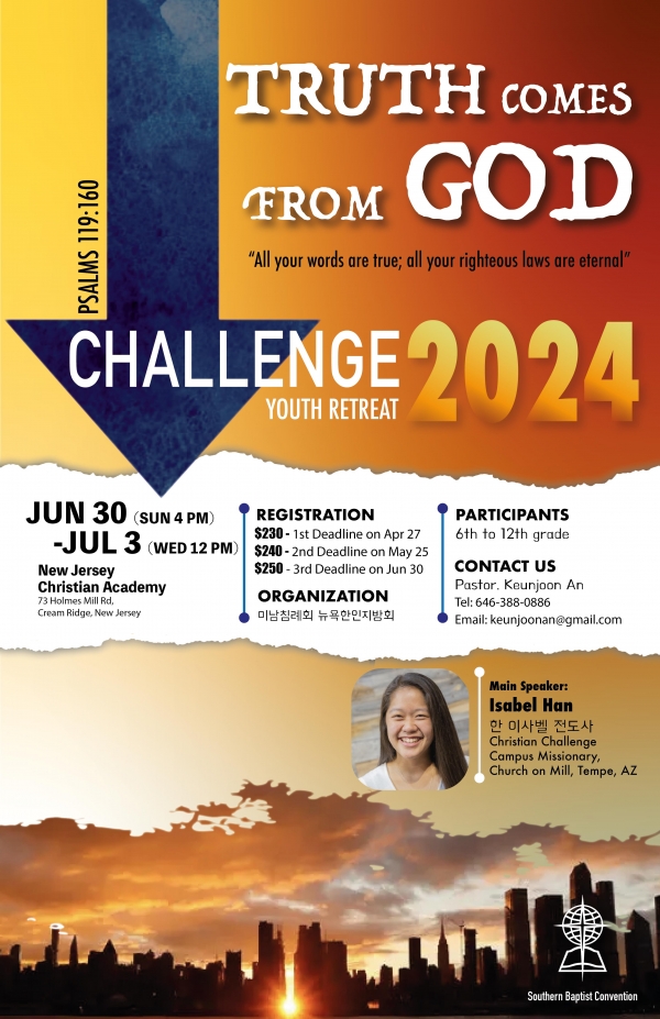 "2024 Challenge Youth Retreat"을 위하여 많은 기도와 격려를 부탁 드리며 여러분의 모든 청소년 자녀들을 초청합니다.