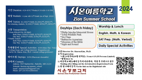 helping them. You can register online via Zion Presbyterian Church website (thezion.org/summer_school). The deadline for the registration is May 31st (Friday).
