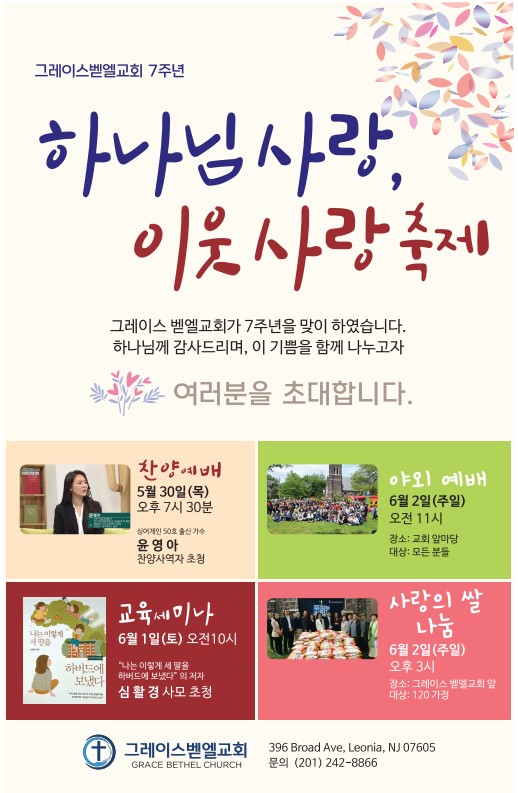 하나님의 은혜와 사랑가운데에서 그레이스 벧엘교회가 7주년을 맞이하였습니다. 지금까지 인도해 주신 에벤에셀의 하나님께 감사드리며, 이 기쁨을 이웃들과 함께 나누고자 합니다