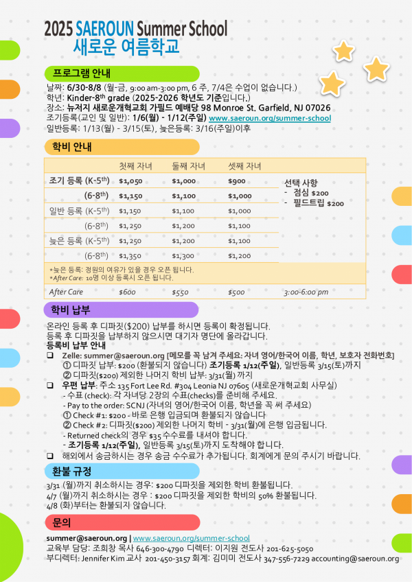 뉴저지 새로운 여름학교(Summer School) | www.saeroun.org/summer-school