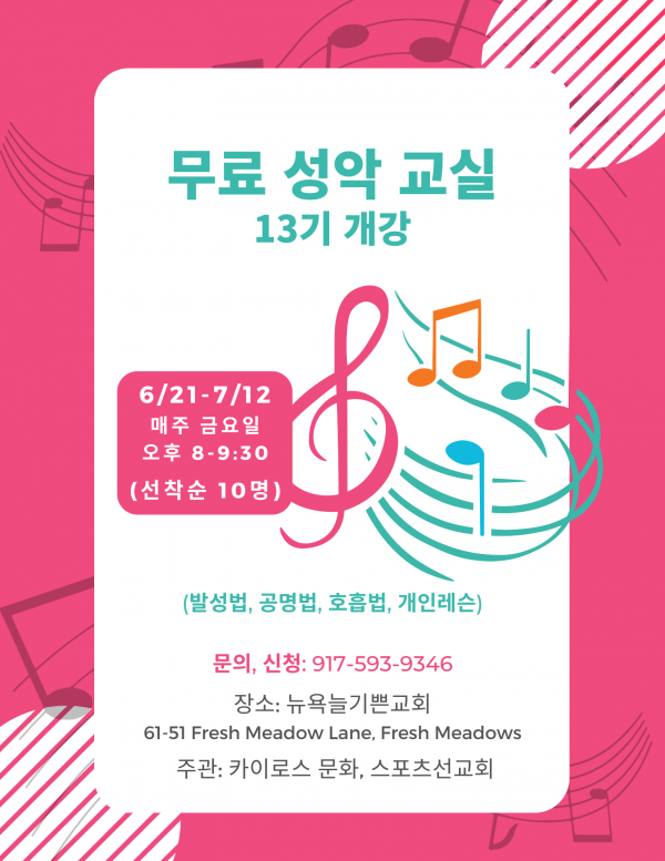 '무료 성악교실 제13기'는 2024년 6월 21일 개강하여 4주 과정으로 매주 금요일 오후 8시부터 9:30까지 뉴욕늘기쁜교회 (61-51 Fresh Meadow Lane)에서 진행되며 참여 인원은 선착순 10명으로 제한됩니다.