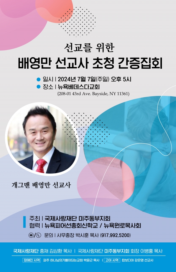 '선교를 위한 배영만 선교사 초청 간증집회'가 있습니다. 집회를 통해 모아진 선교 헌금은 장애우 사역(파주 박윤근 목사)과 캄보디아 고아원 사역(강은영 선교사)을 위해 사용됩니다.