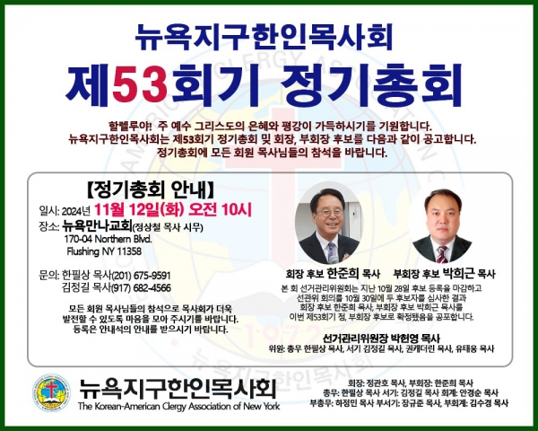 뉴욕지구한인목사회 제53회기 정기총회 / 회장, 부회장 입후보 공고