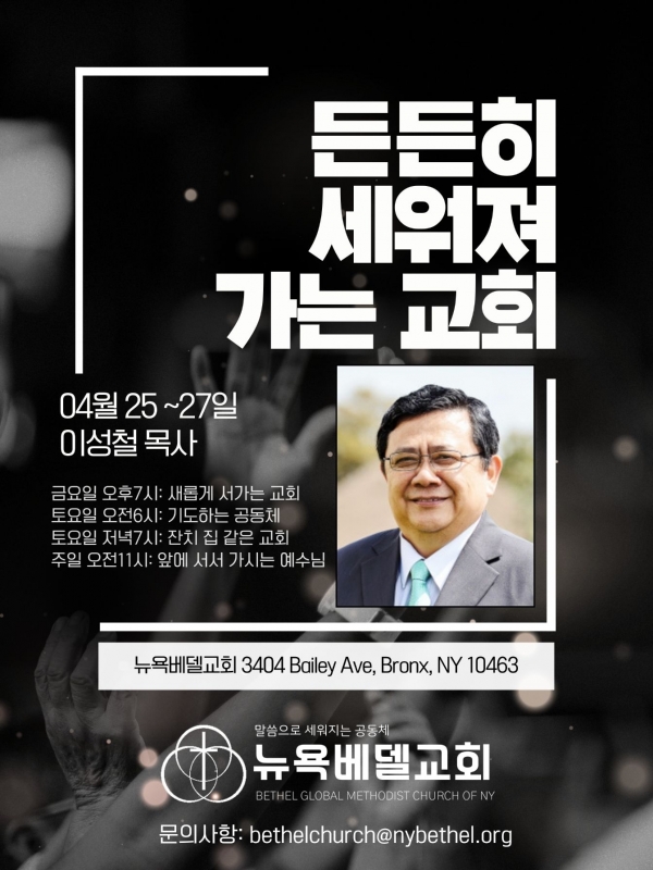 [브롱스, 뉴욕] 뉴욕베델교회(3404 Bailey Ave, Bronx, NY 10463)가 오는 **4월 25일(금)부터 27일(주일)**까지, **“든든히 세워져 가는 교회”**를 주제로 특별 부흥성회를 개최한다.