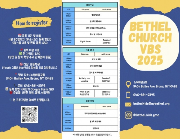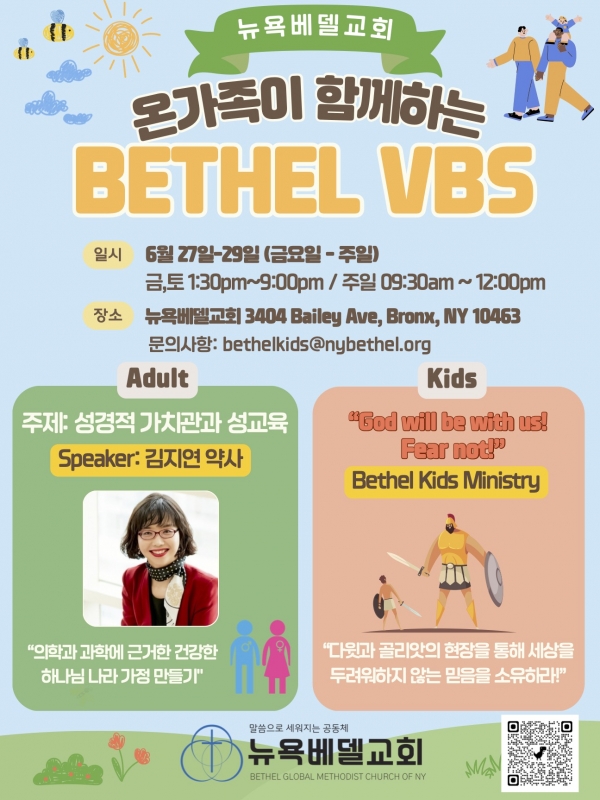 올해 뉴욕베델교회 VBS는 **자녀와 부모가 함께 예배하고 배우며 성장하는 ‘가족 중심 성경학교’**로 준비되었습니다.