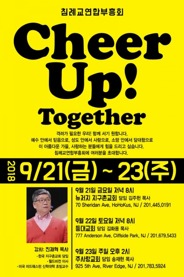 요즘 우울한 소식들이 많이 들려옵니다. 고국의 경제가 어렵다고 합니다. 경제위기라는 말이들려옵니다. 우리가 사는 미국 경기는 좋다고는 하지만 다수의 이민자들이 체감할 정도는 아닙니다. 또 새 정부의 정책 방향은 디아스포라로서의 삶을 더욱 힘들게 하고 있습니다. 영적으로 볼 때도 교회들이 어렵다고 합니다. 한국 기독교인 숫자의 감소는 이미 오래전에 시작되었고 기독교가 사회의 등불이 되기보다는 비난의 대상이 되고 있습니다. 이민 교회들도 생존 자체에 위협을 받는 교회들이 점점 늘어가고 있습니다. 하지만 이런 어려움을 숙명으로 받아들이며 체념하는 것은 교회의 올바른 모습이 아닙니다. 죽음을 이기고 부활하신 예수님을 따라 다시 힘을 내서 일어서야 할 때입니다. 혼자서는 어렵지만, 함께 힘을 모으면 가능합니다. “한 사람이면 패하겠거니와 두 사람이면 맞설 수 있나니 세 겹줄은 쉽게 끊어지지 아니하느니라”(전도서 4:12)라는 말씀처럼 우리 침례교회들부터 연합하여 일어서야겠습니다. 그런 의미에서 이번 집회의 구호를 “Cheer Up Together!!” 라고 정했습니다. 우리 구주 예수 그리스도 안에서 영적으로, 정서적으로 함께 힘을 낼 기회가 되었으면 좋겠습니다.