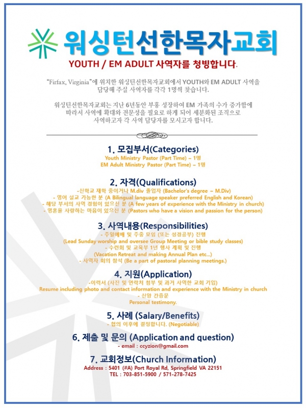 [VA] Youth와 EM Adult 사역자를 각각 찾습니다. 페이지 정보 워싱턴선한목자교회ㆍ2019-08-02 관련링크 이전글 다음글 수정 삭제 목록 본문 사진을 클릭하면 크게 보실 수 있습니다. 댓글목록 등록된 댓글이 없습니다. 이전글 다음글 수정 삭제 목록