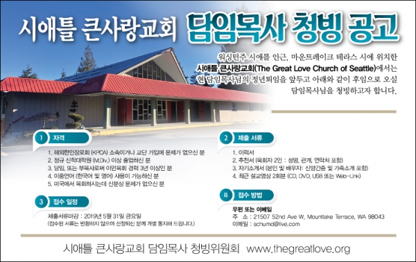 워싱턴주 시애틀 인근, 마운트레이크 테라스 시에 위치한 시애틀 큰사랑교회(The Great Love Church of Seattle)에서 현 담임목사님의 정년퇴임을 앞두고 아래와 같이 후임으로 오실 담임목사님을 청빙하고자 합니다.