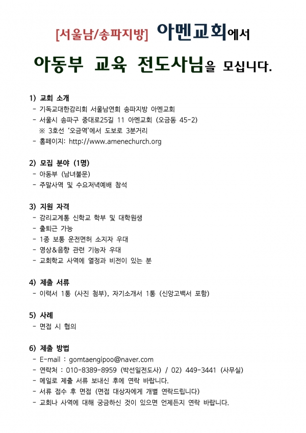 [서울/송파] 아멘교회에서 교육(파트) 전도사님을 모십니다.