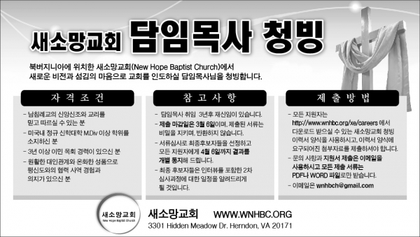 • 모든 지원자는 버지니아 새소망교회 웹사이트 www.wnhbc.org/xe/careers 에 올려진 새소망교회 소개의 글을 참고하시고, 웹페이지 하단에 다운로드 받으실수 있는 새소망교회 청빙 이력서 양식을 사용하시어, 이력서 양식에서 요구되는 자료를 이메일에 첨부하셔서 제출하시면 됩니다.
