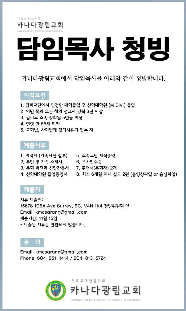 캐나다 벤쿠버에 있는 카나다광림교회에서 담임목사님을 청빙합니다.