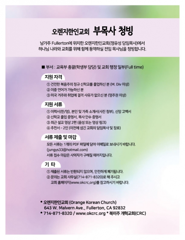 교회 홈페이지(www.okcrc,org)를 참고하시기 바랍니다.