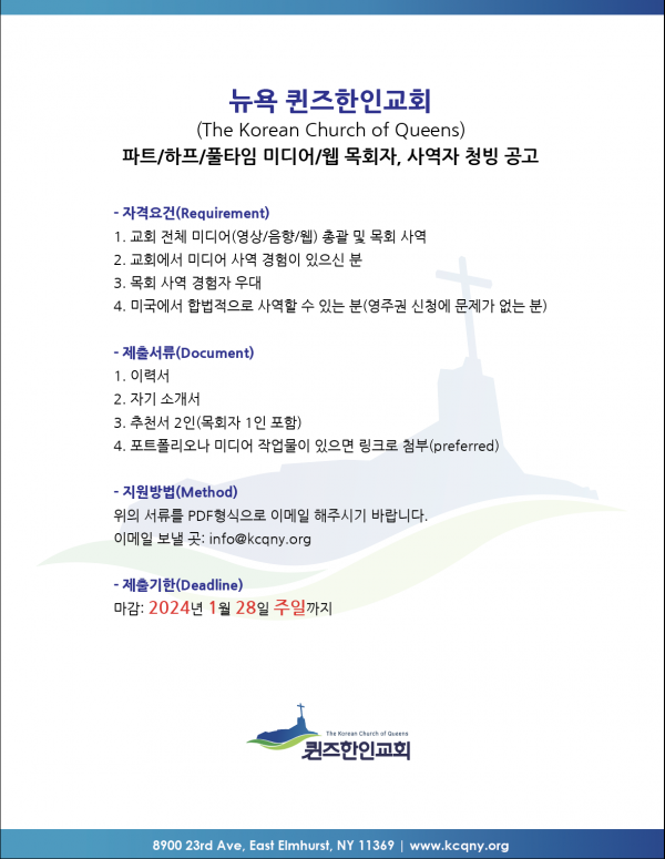 [NY] 퀸즈한인교회에서 미디어/웹 목회자님을 청빙합니다
