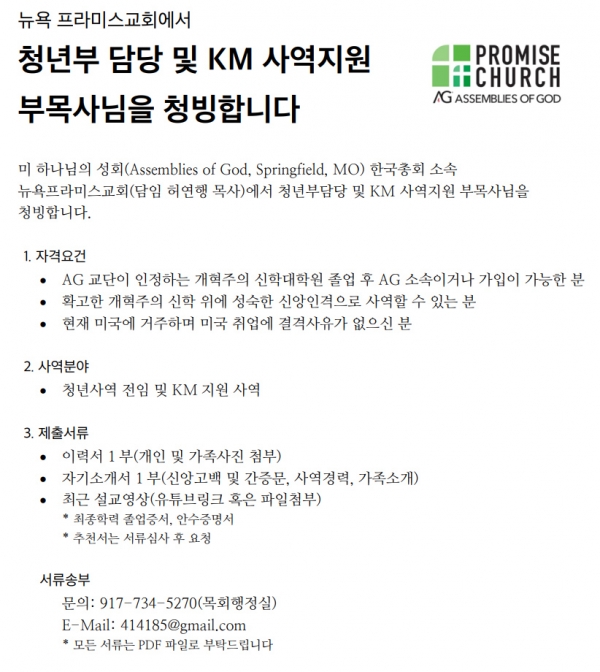뉴욕 프라미스교회에서 청년부 담당 및 KM 사역지원 부목사님을 청빙합니다 페이지 정보 프라미스교회ㆍ2024-01-15 관련링크 이전글 다음글 목록 본문 뉴욕 프라미스교회에서 청년부 담당 및 KM 사역지원 부목사님을 청빙합니다 댓글목록 등록된 댓글이 없습니다. 이전글 다음글 목록