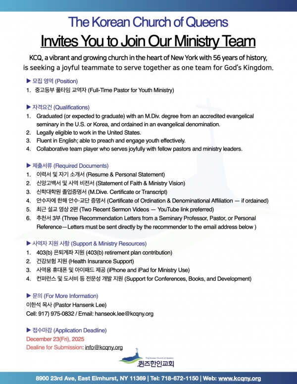 The Korean Church Of Queens in New York is seeking a Youth Ministry Pastor. Please refer to the attached job announcement for details. Thank you.