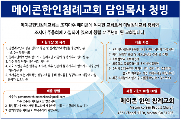 메이콘 한인침례교회 담임목사 청빙