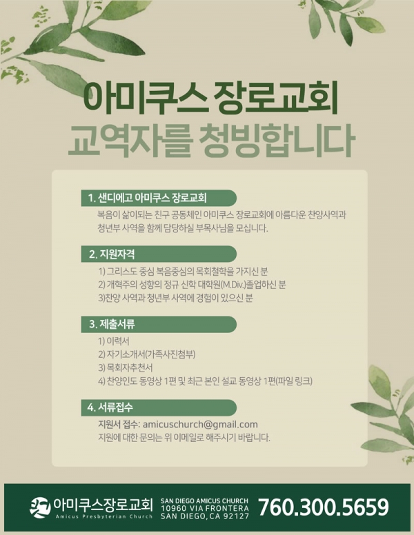 [CA] 아미쿠스장로교회 교역자 청빙 페이지 정보 아미쿠스ㆍ2023-01-17 관련링크 이전글 다음글 목록 본문 [CA] 아미쿠스장로교회 교역자 청빙 댓글목록 등록된 댓글이 없습니다. 이전글 다음글 목록