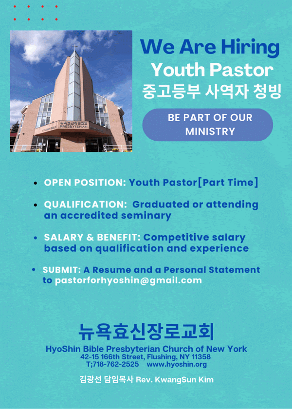 [NY] Youth Pastor/중고등부 사역자 페이지 정보 효신교회ㆍ2022-11-17 관련링크 이전글 다음글 목록 본문 [NY] Youth Pastor/중고등부 사역자 댓글목록 등록된 댓글이 없습니다. 이전글 다음글 목록