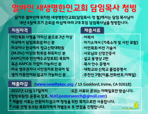 얼바인새생명한인교회 담임목사 청빙 > 구인