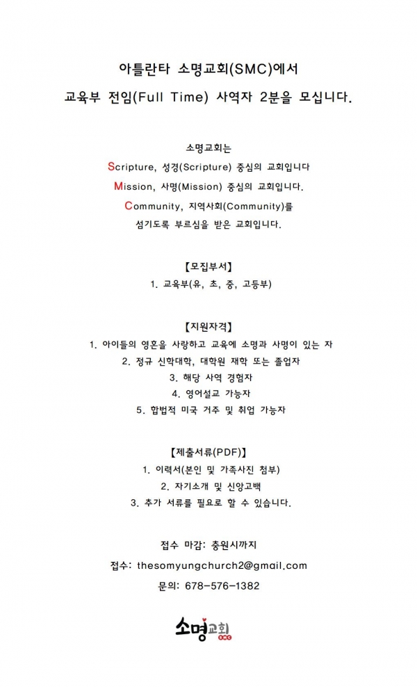 (아틀란타) 교육부 풀타임 사역자 2분을 모십니다.
