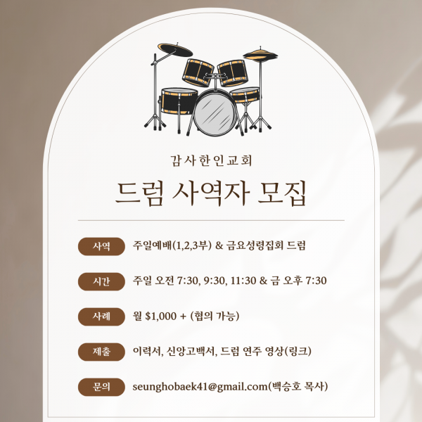 [CA] 감사한인교회에서 드럼 사역자를 모십니다.
