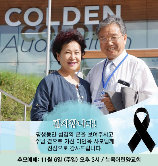 뉴욕교계를 위해 헌신봉사 하시고 뉴욕어린양교회에서 은퇴한 후 한국에서 선교사역에 힘써 오시던 김수태 목사의 부인 이인옥 사모가 지병으로 한국시간으로 10월 29일(토) 새벽 3시5분에 소천했다. 한국 전화번호 011-82-10-6236-4551. 한편 뉴욕어린양교회는 추모예배를 11월 6일(주일) 오후 3시 본당에서 드린다.