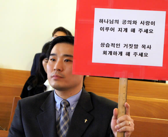 조경윤 목사는 정기노회가 열리는 뉴저지장로교회 예배당 방청석에서 하늘문교회 노회 가입건을 처리할때 "하나님의 공의와 사랑이 이루어지게 해주세요. 상습적인 거짓말 목사 회개하게 해 주세요"라는 내용이 담긴 피켓을 들고 무언의 시위를 펼쳤다.