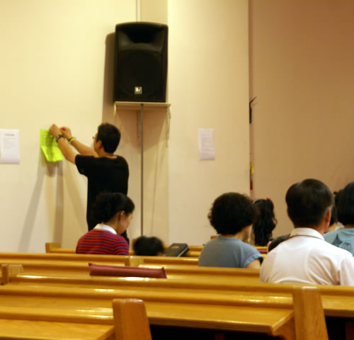 ▲선교지에 나간 교인들의 기도제목을 예배당 벽에 붙이고 있습니다.