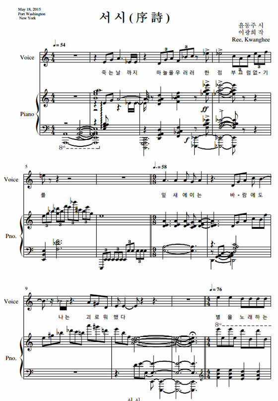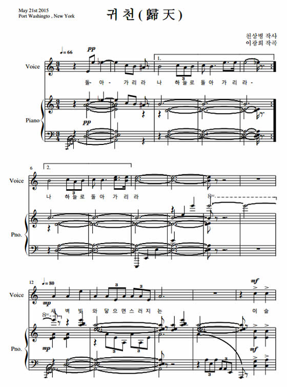 이광희 목사는 오는 10월 한국에서 작곡 발표회를 연다. 이를 위해 곡을 마무리 하고 있는데 윤동주의 '서시'와 천상병의 '귀천' 등에 곡을 붙였다. 두 곡의 공통점은 하늘나라를 이야기 하고 있다. 윤동주는 서시에서 "하늘을 우러러 한 점 부끄럼 없기를"라고 노래했으며, 천상병은 귀천에서 "나 하늘로 돌아 가리라... 아름다운 이 세상 소풍 끝나는 날 가서 아름다웠더라고 말 하리라"라고 노래하고 있다.