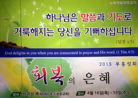 2013년 8월말 퀸즈장로교회 담임목사 직을 전격 사임하고 LA 소재 세리토스장로교회로 목회지를 옮겼던 박규성 목사가 1년반만에 뉴욕에 왔다. 모습은 부흥성회 강사이다. 박규성 목사는 동문인 조성훈 목사의 초청으로 뉴욕제일장로교회에서 4월 16일(목)부터 4일간 "회복의 은혜"라는 주제로 부흥성회를 인도했다. 뉴욕행에 부담을 가진 박규성 목사를 고려해 뉴욕제일장로교회는 외부광고 없이 내부행사로 부흥성회를 치루었다.