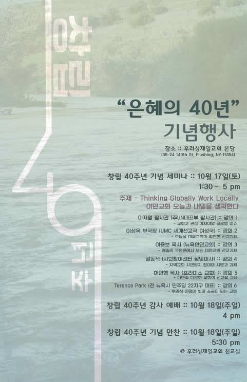 후러싱제일교회(담임 김정호 목사)가 창립 40주년을 “은혜의 40년”으로 기념하여 10월 17일(토) 오후 1시30분부터 5시까지 “이민교회 오늘과 내일을 생각한다(Think Globally Work Locally)”라는 주제로 세미나를 개최한다. 교회와 사회를 연결하는 목회방향성을 가진 김정호 목사의 성향이 잘 나타나는 세미나로, 이번 세미나가 일회성이 아니라 여러 모습으로 계속 나타날 것으로 기대되고 있다.