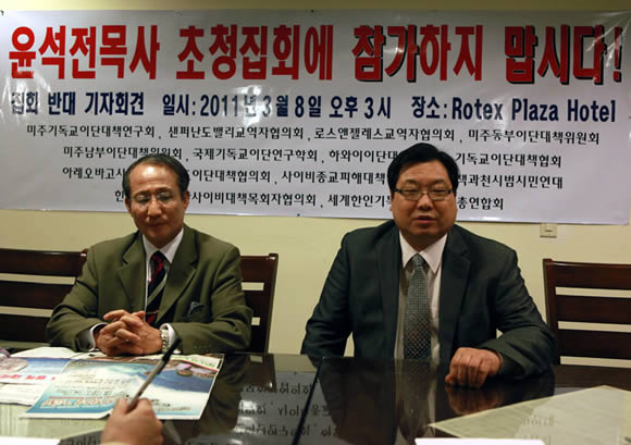 미주동부이단대책위원회 회장 이종명 목사가 3월 8일(화) 남가주를 방문하고 한선희 목사(미주기독교이단대책연구회 회장)등과 윤석전ㆍ김항안목사의 남가주 영적대각성집회를 반대하는 기자회견을 열었다.