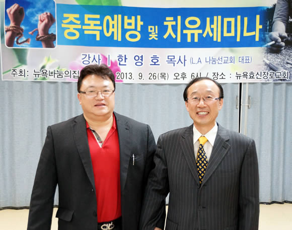 뉴욕 나눔의 집(대표 박성원 목사)는 9월 26일(목) 오후 6시 뉴욕효신장로교회에서 중독예방 및 치유세미나를 열었다. 강사는 LA에서 나눔선교회를 운영하고 있는 한영호 목사. 1997년 6월 창립된 나눔선교회는 중독자들의 재활기관로서 재활센터를 운영하고 있으며, 각종 상담을 담당하고 있다.