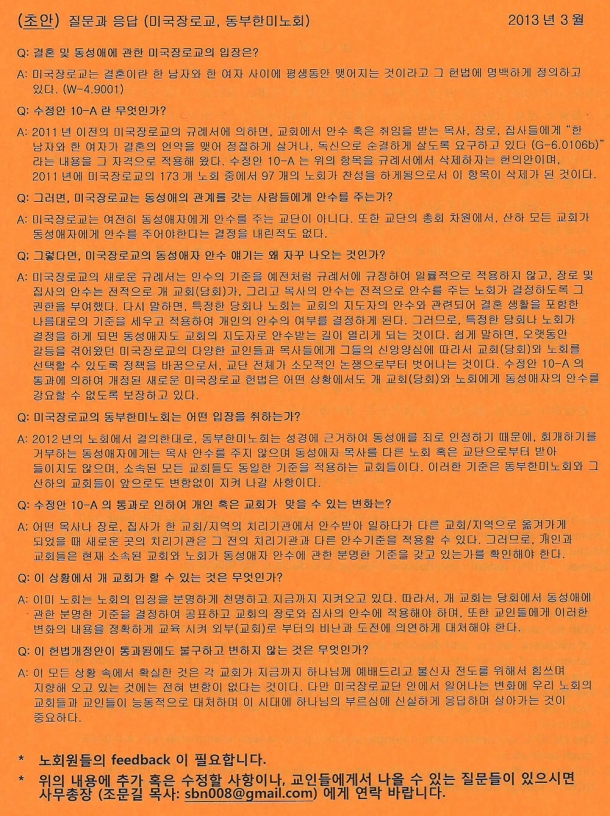 초안에는 △결혼 및 동성애에 대한 미국장로교의 입장은 △수정안 10-A는 무엇인가 △미국장로교는 동성애 관게를 갖는 사람에게 안수를 주는가 △미국장로교에 동성애자 안수에 대한 이야기가 왜 자꾸 나오는가 △노회의 입장은 △통과된 동성애에 대한 교단의 정책으로 인해 교회가 맞이할수 있는 변화는 △이런 상황에서 개교회가 할 수 있는 것은 무엇인가 △개정안 통과에도 불구하고 변하지 않는 것은 무엇인가등의 질문과 답이 들어있다.