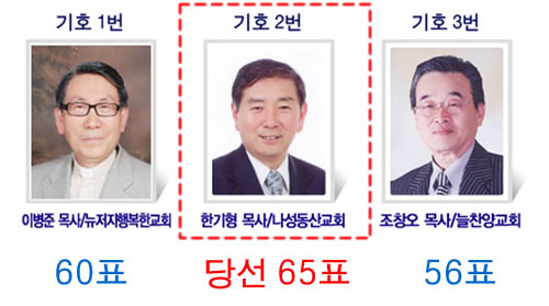 한기형, 이병준, 조창오 목사등 3명이 후보로 나와 박빙으로 대결한끝에 한기형 목사 65표, 이병준 목사 60표, 조창오 목사 56표로 한 목사가 당선되었다. 미주동부에서 나온 1번 이병준 목사(뉴저지행복한교회)는 5표 차이로 아깝게 낙선됐다.